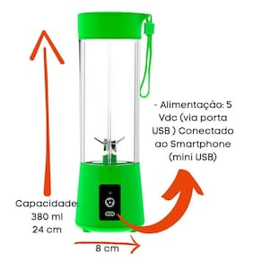 Especificações: - Capacidade: 380 ml - Modelo do motor: 3,6 Vdc - Rotação do motor: Sem carga: 22000 RPM / Carga: 15000 RPM - Corrente de trabalho: 10-12 A - Bateria: 3,7 Vdc - Capacidade da bateria: 2000mAh - Alimentação: 5 Vdc via porta USB Conectado ao Smartphone mini USB - Tempo de recarga: 3 horas aproximadamente - Único tempo de trabalho: 90 s - Proteção ociosa: Desliga em 5 s - Carga completa usando tempos: 10-12 vezes - Material da lâmina de corte: SUS304