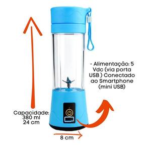 Você pode recarregar a bateria deste liquidificador através de uma porta USB, utilizando um carregador de celular, powerbank ou conectando-o ao seu smartphone. O tempo de recarga é de aproximadamente 3 horas e ele pode ser recarregado cerca de 10 a 12 vezes com uma carga completa.