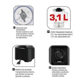 Liquidificador Power Max 3,1 Litros 700w Ln50 Arno Preto 220v Grande capacidade e força para as suas receitas!!!