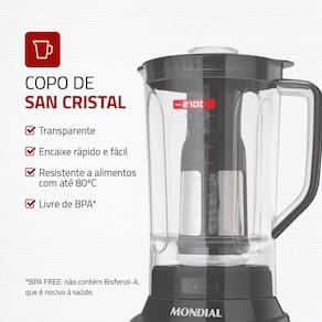 JARRA RESISTENTE : O copo do liquidificador é feito de San Cristal, material resistente, super transparente e que não pega cheiro ou cor.