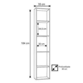 O Shopping RM apresenta uma ótima opção para sua casa, o livreiro Janaina. Desenvolvido para você que procura bem-estar e modernidade em um só produto. Produzido com materiais de qualidade, proporcionando maior durabilidade e resistência ao móvel. Deixe seus livros e cadernos organizados com este incrível livreiro!! Um móvel funcional que vai auxiliar você na organização do seu ambiente.  Não perca tempo e garanta já o seu!!   Dimensões do Produto:   A: 184 cm  L: 33 cm  P: 30,5 cm  Peso: 19 kg   Carasterísticas: Material da Estrutura: MDP Possui Prateleiras: Sim Acabamento: Pintura UV Diferencial: Design Moderno   Montagem:  Volumes: 1 Volume Manual de montagem: Sim Sistema de montagem: Cavilhas/ Minifix/ Parafusos O produto pode estar sendo montado pelo comprador ou montador profissional   Recomendação de Limpeza: Limpar com flanela limpa e seca. Não molhar o móvel e não expor em lugar úmido ou próximo de fontes de calor, não usar produtos abrasivos.
