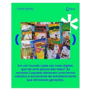Relaxe, descubra e divirta-se: seu momento de bem-estar com o Caça-Palavras Ouro 96 páginas Nível fácil Passatempos com temáticas diversas: curiosidades, culinária, natureza, história, saúde, cultura e muito mais Ideal para iniciantes, adultos e idosos que buscam lazer, estímulo mental leve e uma pausa das telas O Caça-Palavras Ouro é uma edição pensada para proporcionar momentos de prazer, relaxamento e estímulo leve da mente. Com 96 páginas de passatempos acessíveis, este volume traz uma seleção de jogos temáticos com base em textos informativos e divertidos sobre história, culinária, saúde, natureza, música e curiosidades culturais. Cada caça-palavras é acompanhado por um conteúdo editorial que instrui, entretém e guia o desafio. Indicado para leitores de todas as idades, especialmente adultos e idosos que desejam manter a mente ativa, reduzir o desconforto e exercitar a atenção de forma prazerosa e sem pressão. Com a curadoria editorial da Coquetel, marca sinônimo de qualidade e tradição, esta publicação é perfeita para quem busca bem-estar com todas as letras. Marca: Não Informado