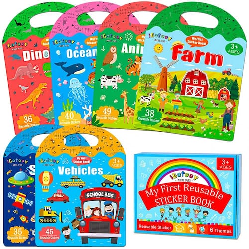 Livros adesivos reutilizáveis iGetooy para crianças de 2 a 4 anos 1. Essencial para viagens infantis - é muito adequado para viagens infantis, como no carro, no trem e no avião, para manter seus filhos ocupados e torná-los mais agradáveis na viagem. 2. O livro de adesivos para crianças vem com uma alça portátil e um local para guardar adesivos, que podem ser utilizados em qualquer lugar, a qualquer hora. Os adesivos para crianças podem ser utilizados não apenas em livros de adesivos, mas também em todos os tipos de superfícies lisas, como janelas, espelhos, garrafas de água e geladeiras. 3. Os livros de adesivos reutilizáveis são presentes ideais para crianças, adolescentes, meninas e adultos. Em festivais específicos, presentes de aniversário, presentes de Dia dos Namorados, presentes de Halloween, presentes de Natal, presentes de Dia das Crianças. - 6 conjuntos de livros de adesivos reutilizáveis: inclui veículos, fazenda, espaço, dinossauros, animais e mundo oceânico. 243 adesivos reutilizáveis para crianças de 2 a 4 anos. O adesivo pode ser colado em qualquer posição neste livro e em todos os tipos de superfícies lisas sem deixar resíduos, como janelas, espelhos, garrafas de água e geladeiras. - Portátil e durável - O livro de adesivos vem com uma bolsa de transporte que é fácil de transportar quando você sai ou viaja, pode armazenar bem os adesivos sem cair. Pode ser utilizado em qualquer lugar, a qualquer hora. Mesmo que os adesivos de gelatina caiam no chão e fiquem sujos, enxágue com água e você poderá reutilizá-lo. - Essencial para viagens infantis - é muito adequado para viagens infantis, como no carro, no trem e no avião, para manter seus filhos ocupados e torná-los mais agradáveis na viagem. - Livro de atividades infantis - Um jogo de atividades incrível para passeios de carro, avião, ou em qualquer lugar como uma igreja, restaurante, parque, geladeira, paredes, salas de aula, creche, quartos, salas de jogos e muito mais! Perfeito para brinquedos de viagem para crianças para manter seus filhos ocupados. - Ótimo presente para crianças - Perfeito para escola em casa, pré-escola, jardim de infância ou trabalho complementar. Oferece uma experiência de aprendizagem divertida e interativa para os primeiros alunos. Ideias de presente perfeitas para crianças no aniversário, Natal, ano novo, etc. - Brinquedos de aprendizagem de educação pré-escolar - Este livro de adesivos gelatinosos pode desenvolver as habilidades motoras finas da criança, coordenação óculo-manual e melhorar a concentração. Pode ajudar as crianças a aprender palavras e reconhecer as coisas facilmente através da brincadeira.