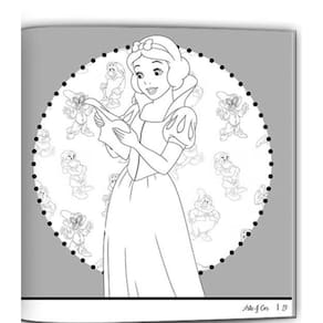 Livro de colorir arte & cor branca de neve Dê cores para personagens como o príncipe encantado, os sete amigos, os animais do bosque, a rainha má e a bruxa que lhe dá uma maçã envenenada