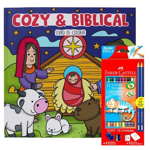 Kit Livro de Colorir Cozy & Biblical Com Lápis de Cor Faber-Castell.