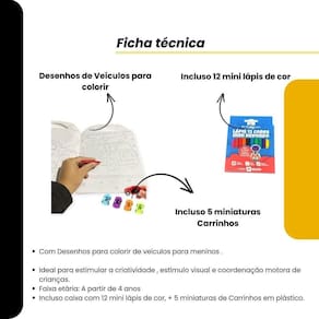 Miniaturas inclusas: além de colorir, as crianças poderão brincar com cinco miniaturas de carrinhos, proporcionando uma experiência interativa que une arte e brincadeira.