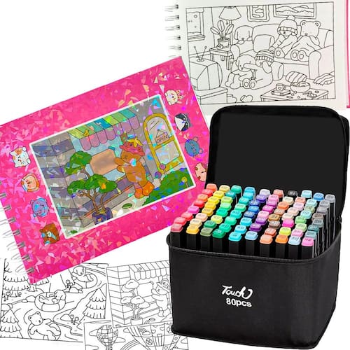 Este kit já acompanha um conjunto com 80 canetinhas coloridas, ou seja, você não precisa se preocupar com nada! É só abrir e começar a colorir!