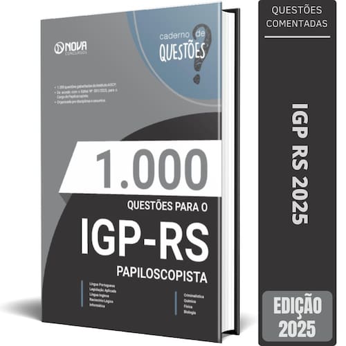Livro de Questões Gabaritadas para o IGP RS 2025 - Papiloscopista Livro 1.000 Questões Gabaritadas para o IGP-RS - Papiloscopista -LV207-25-1000-QUESTOES-IGP-RS-PAPI-IMP Instituição Instituto-geral de Perícias do Rio Grande do Sul - IGP-RS Cargo s Papiloscopista Estado RS Edição Oficial Páginas 292 Disciplinas: Língua Portuguesa Legislação Aplicada Língua Inglesa Raciocínio Lógico Informática Criminalística Química Física Biologia Ean: 7908428812010