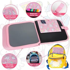 🎨 Kid's Road Trip Essentials — O livro de grafite apagável para crianças tem botões adesivos na parte externa para mantê-lo no lugar e um bolso para canetas na parte interna para 12 canetas de aquarela. Mesmo em carros, aviões e outros meios de transporte, as crianças podem desenhar o quanto quiserem.
