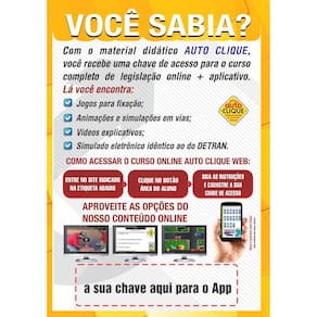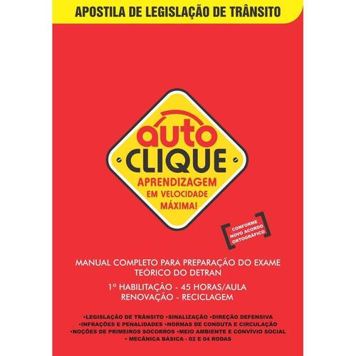 Faça como mais de 2 milhões de alunos que já estudaram pelo Auto Clique. Você que está passando pelo processo de habilitação, renovação ou reciclagem para condutor infrator e quer passar na prova do DETRAN de primeira, não deixe que conferir esta grande Adquirindo nossa Apostila do aluno + Apostila de provas do DETRAN você ganha uma chave de acesso que dá direito a usar nosso Aplicativo de estudos por 90 dias. Especificações da Apostila Manual para primeira habilitação, completo, com excelente ilustrações que abordam todas as matérias exigidas pela Legislação de trânsito e que caem na prova do DETRAN de todos os estados. O manual é 100% atualizado O manual contém 162 páginas e aborda as seguintes disciplinas: Legislação de trânsito / Infrações e penalidades / Sinalização de trânsito / Conduta e circulação / Direção defensiva / Primeiros soros / Meio ambiente e convívio social / Noções de mecânica - 2 e 4 rodas.