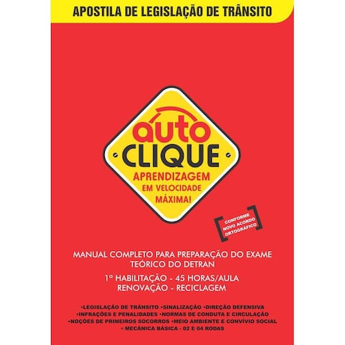 Faça como mais de 2 milhões de alunos que já estudaram pelo Auto Clique.Você que está passando pelo processo de habilitação, renovação ou reciclagem para condutor infrator e quer passar na prova do DETRAN de primeira, não deixe que conferir esta grande promoçãoAdquirindo nossa Apostila do aluno + Apostila de provas do DETRAN você ganha uma chave de acesso que dá direito a usar nosso Aplicativo de estudos por 90 dias.Especificações da ApostilaManual para primeira habilitação, completo, com excelente ilustrações que abordam todas as matérias exigidas pela Legislação de trânsito e que caem na prova do DETRAN de todos os estados. O manual é 100% atualizadoO manual contém 162 páginas e aborda as seguintes disciplinas:Legislação de trânsito / Infrações e penalidades / Sinalização de trânsito / Conduta e circulação / Direção defensiva / Primeiros soros / Meio ambiente e convívio social / Noções de mecânica - 2 e 4 rodas.