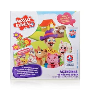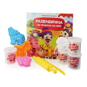 O livro Fazendinha, contará a história dos animais na fazenda. A vaca, o porco, a ovelha e o cavalo viverão altas aventuras e se divertirão muito nessa história contada na Fazendo do Senhor Bem. O conjunto acompanha: 4 potes de massa de 50g cada, os moldes dos personagens, faquinha, rolinho e cenário. Assim as crianças poderão criar suas próprias histórias.