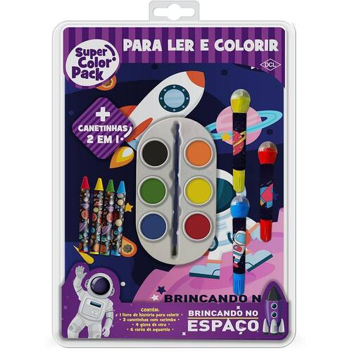 Livro Infantil Colorir Espaço Super Color Pack. Livro cheio de diversão para brincar no espaço sideral. Este blister inclui livro para ler e colorir, gizes de cera, paleta de aquarela e canetinhas com carimbos acoplados. Ean: 9786556580371