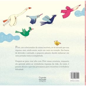 Flint, um colecionador de coisas incríveis, se vê cercado por sua riqueza, mas, ainda assim, sente um vazio no coração. Em busca de diversão e amizade, o pequeno pássaro decide embarcar em uma jornada rumo à completude. Prepare-se para voar alto com Flint nessa aventura, enquanto ele aprende sobre as verdadeiras riquezas da vida. Às vezes, é preciso deixar o que não precisamos para encontrar a verdadeira felicidade.