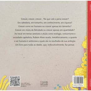 Crescer, crescer, crescer... No que vale a pena crescer Em sabedoria, em tamanho, em conhecimento, em riqueza Crescer como ser humano ou crescer apenas em tamanho Crescer em níveis de felicidade ou crescer apenas em quantidade Ao tocar em temas sensíveis e atuais como ecologia, consumismo e sociedade capitalista, Rubem Alves revela, metaforicamente, o quanto o ser humano é ambicioso e qual os resultados de sua ambição. Um livro para todas as idades, que, indiscutivelmente, faz pensar.