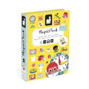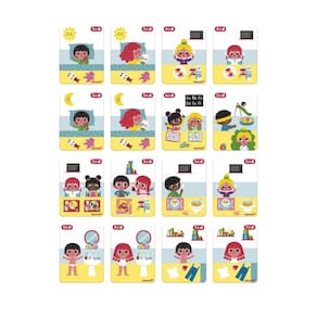 A premissa é simples: recrie a cena cotidiana indicada no cartão e associe um horário a ela. A que horas tomo meu café da manhã? Quando é a hora da soneca? E muitas outras. Graças aos 75 ímãs e aos 8 cartões modelo de dupla face incluídos, podem ser reproduzidas 16 cenas cotidianas! Uma vez que o livro está aberto, as crianças podem colocar os ímãs no lado magnético onde permanecerão no lugar: perfeito para viagens longas de carro ou esperas.