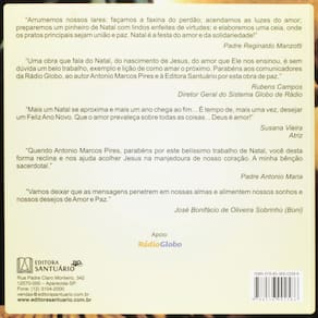 INCLUI CD COM MENSAGENS NAS VOZES DOS COMUNICADORES DA RÁDIO GLOBO"Arrumemos nossos lares; façamos a faxina do perdão; acendamos as luzes do amor, preparemos um pinheiro de Natal com lindos enfeites de virtudes; e elaboremos uma ceia, onde os pratos principais sejam união e paz.Natal é a festa do amor e da solidariedade!"Padre Reginaldo Manzotti"Uma obra que fala do Natal, do nascimento de Jesus, do amor que Ele nos ensinou, é sem dúvida um belo trabalho, exemplo e lição de como amar o próximo.Parabéns aos comunicadores da Rádio Globo, ao autor Antonio Marcos Pires e à Editora Santuário por esta obra de paz."Rubens Campos Diretor Geral do Sistema Globo de Rádio"Mais um Natal se aproxima e mais um ano chega ao fim...É tempo de, mais uma vez, desejar um Feliz Ano Novo.Que o amor prevaleça sobre todas as coisas...Deus é amor!"Susana Vieira Atriz"Querido Antonio Marcos Pires, parabéns por este belíssimo trabalho de Natal, você desta forma reclina e nos ajuda acolher Jesus na manjedoura de nosso coração.A minha bênção sacerdotal."Padre Antonio Maria"Vamos deixar que as mensagens penetrem em nossas almas e alimentem nossos sonhos e nossos desejos de Amor e Paz."José Bonifácio de Oliveira Sobrinho (Boni)Apoio Rádio GloboINFORMAÇÃO ADICIONALACABAMENTO: BrochuraPESO: 0,251DIMENSÕES: 18×18EDIÇÃO: 1ªANO DE LANÇAMENTO: 2011NÚMERO DE PÁGINAS: 104ESTADO DO LIVRO: LACRADO Acompanha CD