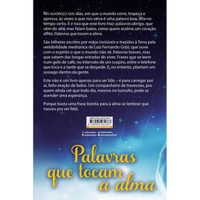 Em formato de mensagens mediúnicas, Palavras que tocam a alma apresenta textos curtos que percorrem temas como a presença divina no cotidiano, a importância da gratidão, o poder das preces silenciosas e a beleza da transformação interior. Cada trecho é um convite suave para a pausa, a reflexão e o reencontro com a essência espiritual que nos habita, revelando como o amor e a fé podem ser sementes discretas, mas poderosas, no solo de nosso coração.