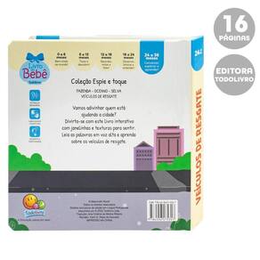 Livro para bebê espie e toque veículos de resgate vamos adivinhar quem está ajudando a cidade Divirta-se com este livro interativo com abas para levantar e texturas para sentir. Leia as palavras em voz alta e aprenda sobre os veículos de resgate. Características: - editora: todolivro; - tamanho aproximado do livro: 18 x 18cm; - habilidades desenvolvidas: estímulo sensorial, habilidades cognitivas e desperta a criatividade; - acabamento: cartonado com janelas e texturas toque e sinta; - faixa etária: 24 a 36 meses; - quantidade de páginas: 16; - tipo de capa: dura; -imagens meramente ilustrativas- atenção: a cor do produto pode variar de acordo com o monitor atenção: o fabricante pode alterar a cor de alguma parte do produto sem aviso prévio.