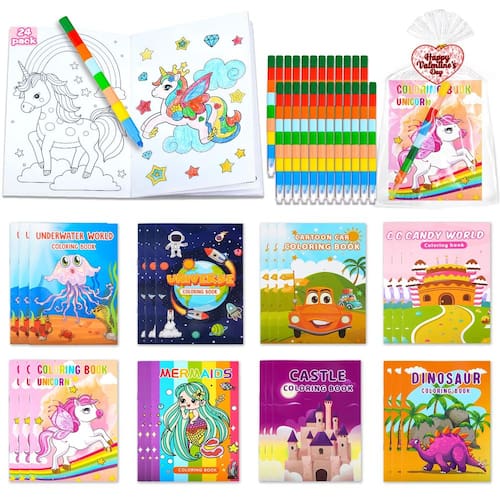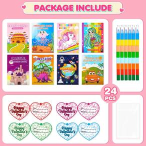 Presentes de Dia dos Namorados para crianças - Pacote com 24 livros de colorir para crianças com cartões coloridos de Dia dos Namorados, lembrancinhas de festa de troca de sala de aula para crianças de 4 a 8 anos - Presentes de Dia dos Namorados para crianças - Presentes de Dia dos Namorados para crianças: acima de 3 anos de idade. Um total de 24 livros de colorir em 8 estilos, um total de 24 canetas coloridas em 8 cores, um cartão de Dia dos Namorados em forma de coração em 4 cores e uma bolsa de presente transparente combinando. Ótimo para presentes, bolsas de festa infantil e prêmios de sala de aula de estudantes. - Livro de colorir: inclui rabiscos estampados com 8 temas como dinossauros, castelo, sereias, unicórnio, mundo dos doces, carro de desenho animado, universo, mundo subaquático etc., 6 páginas diferentes de belos padrões dentro de cada livro, atende às suas necessidades de bricolage, proporciona uma experiência de desenho mais divertida para as crianças, deixe seus filhos brincarem o dia todo. - Lembranças de festa para crianças: cada livro de aquarela infantil mede aproximadamente 18 x 12 cm, fácil para as crianças colorirem. Seja para escola, viagens, atividades ao ar livre, festas de aniversário, brincar com amigos, atividades de férias em família, as crianças podem tirar o livro de atividades de colorir para crianças a qualquer hora e em qualquer lugar. - Presentes de Dia dos Namorados para crianças: presentes ideais para meninos e meninas em aniversários, lembrancinhas de festa, Dia dos Namorados, Páscoa, Halloween, Natal, Ação de Graças, presentes de Natal, sacolas de presente, atividades de grupo grande, viagens, atividades de volta às aulas, atividades de pintura DIY em sala de aula e muito mais. - Presentes de Dia dos Namorados: Este é um grande presente popular, embalado em uma pequena bolsa de presente, adequado para atividades de pintura DIY em sala de aula, ajudam as crianças a fazer você mesmo livremente e pintar seu próprio tema, o que pode exercitar o reconhecimento de cores e a capacidade prática das crianças.