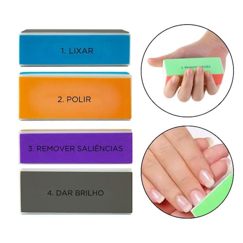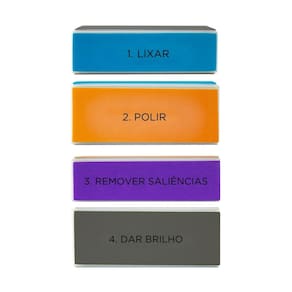 Face 1: Lixar - Com textura mais abrasiva, o lado “File Nail Edge” serve para dar forma às bordas da unha, ajustando o comprimento e o formato desejado. Face 2: Remover Saliências - O lado “Remove Ridges” é utilizado para nivelar e remover saliências ou irregularidades na superfície da unha. Ela possui uma textura para alisar as unhas. Face 3: Polir - A terceira face “Smooth Nail” é utilizada para suavizar a superfície da unha, possui uma textura fina que deixa a unha com um aspecto mais uniforme.? Face 4: Dar Brilho - “Shine Nail” é o lado mais suave, e é usada para finalizar o processo, proporcionando um acabamento brilhante e saudável à unha.?