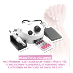 Itens Inclusos: 1 - Motor 1 - Caneta 1 - Pedal 1 - Copinho 1 - Suporte 1 - Conjunto Lixa e brocas 6 lixas e 6 brocas Marca: Lixar Unhas Profissional Ean: 7905246285071