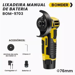 Especificações: - Modelo: BOM-9703 - Voltagem da bateria: 12V - Velocidade sem bloqueio: 19.500rpn - Rosca do eixo de moagem: M5 - Diâmetro do furo: 10.0mm - Capacidade de bateria: 1.5ah - Velocidade nominal: 10000r/min - Diâmetro Máximo: 76mm - Profundidade de corte: 16mm - Parada reversa: No - Teste de rack: 350 horas