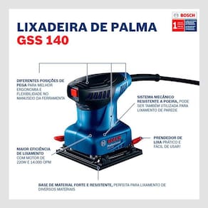 A Lixadeira Orbital GSS140 STD da Bosch é a junção de rendimento e conforto, pois possui 220w de potência e sua empunhadura ergonômica possibilita sua utilização em diversas posições.