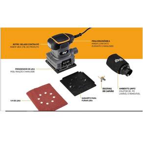 A Lixadeira Orbital possui 250W de potência, proporciona um desempenho sólido, tornando o lixamento mais eficiente e menos trabalhoso. Ideal para lixar madeira maciça, MDF/MDP cru, paredes e outros materiais. O cabo de 2 metros para maior mobilidade durante o trabalho e uma velocidade de 14000 orbitas por minuto. A base da lixa possui o tamanho de 1/4 de uma lixa convencional, ou seja, você compra uma lixa padrão e pode dividir ela em 4 pedaços iguais, sendo assim ela servirá na base da lixadeira, sem precisar fazer ajustes. Facilitando a troca durante o uso. Sua pega ergonômica e emborrada permite maior conforto durante a aplicação de pressão na ferramenta assim, fazendo com que o lixamento seja mais consistente e traga menos vibração para o usuário. A Lixadeira Orbital WAP ELO 250 possui um sistema de grampos que permite uma fácil troca de lixas. Seu botão liga e desliga é selado contra pó. A ferramenta de uso obrigatório em uma bancada de trabalho.