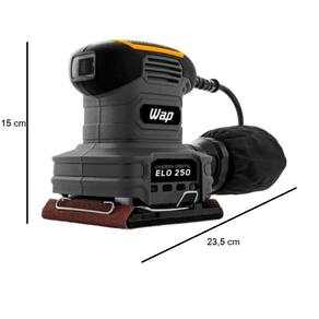 Marca: Wap Modelo: ELO 250 Ref. FW008918 (110V) / FW008919 (220V) Voltagem: 110V Ou 220V Potência: 250W Frequência: 60Hz Velocidade (OPM) : 14.000 Dimensões da base (mm) 110x105 Dimensões da lixa 1/4 (mm): 145x110 Capacidade do coletor: 240ml Nível de ruído (dB(A)): 83 Classe de Proteção / Isolação: Casse II Cabo életrico: 2M Dimensão Produto Montado: Comprimento: 23,5 cm Largura: 11 cm Altura: 15cm Peso Liquído: 1,24Kg