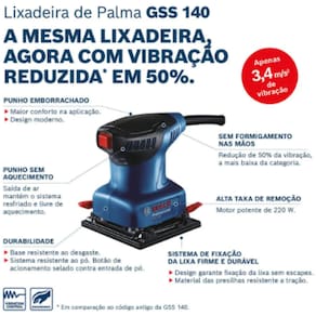 Lixamento de alta eficiência agora é ainda mais confortável com a lixadeira Bosch GSS 140 Professional. Esta versátil ferramenta tem uma alta capacidade de desbaste graças ao seu motor potente de 220 W, o que a torna ideal para trabalho de lixamento mais exigente. Foi especialmente fabricada para garantir mais conforto e menos fadiga ao lixar. Por exemplo, graças a um valor reduzido de vibração até 3,4 m/s2 e às várias opções de pega, a dormência da mão do usuário é menor, mesmo ao lixar acima da cabeça.