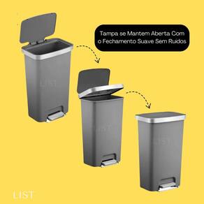Principais Características: - Tampa que se Mantém Aberta e Fechamento Suave: Facilita o descarte de resíduos e proporciona um fechamento suave, evitando ruídos indesejados. - Rodas Embutidas: Desloque a lixeira com facilidade, tornando o descarte de resíduos uma tarefa rápida e prática. - Fixador para Saco Plástico: Evite deslizamentos e mantenha seu saco plástico no lugar, facilitando a troca quando necessário. - Medidas da Lixeira: Altura: 65,2 cm, Largura: 40,9 cm, Profundidade: 29,7 cm. Dimensões ideais para se encaixar perfeitamente em seu espaço.