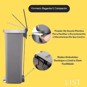Esta lixeira foi projetada para aliar funcionalidade e estilo. Com sua tampa que se mantém aberta, fechamento suave e rodas embutidas, ela é ideal para o dia a dia agitado. O fixador para saco plástico garante praticidade na hora de esvaziar, enquanto suas medidas proporcionam versatilidade na disposição.