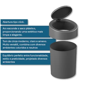 INFORMAÇÕES ADICIONAIS: Para otimizar o uso da Lixeira com Tampa Press, recomendamos o uso de sacolas plásticas de alta resistência. Além disso, o aro interno esconde o saco plástico, proporcionando uma estética mais limpa e elegante para o seu ambiente.