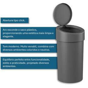 INFORMAÇÕES ADICIONAIS: Para otimizar o uso da Lixeira com Tampa Press, recomendamos o uso de sacolas plásticas de alta resistência. Além disso, o aro interno esconde o saco plástico, proporcionando uma estética mais limpa e elegante para o seu ambiente.