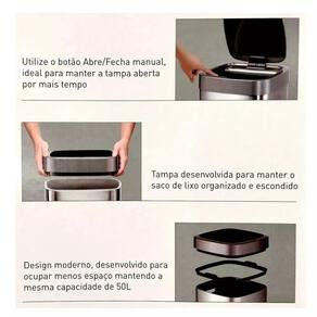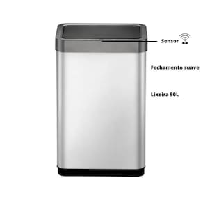 Botão para abrir; Fixador de saco de lixo; Opera com 6 pilhas aa não incluidas ; Distancia de ativação do sensor é de 10 a 20 cm; Design moderno; Em aço inox; Resistente a impressões digitais; Fechamento suave; Marca: Não Informado