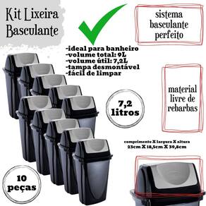 Conjunto com 10 lixeiras. A lixeira com tampa basculante é a solução ideal para manter seus ambientes limpos e organizados com praticidade e estilo. Com capacidade para 7,2 litros, esta lixeira é perfeita para uso doméstico ou em ambientes comerciais, como escritórios, cozinhas, banheiros e áreas de serviço. Fabricada em plástico de alta qualidade, a lixeira é durável e resistente, garantindo um uso prolongado e eficiente. A tampa basculante tipo vai e vem oferece conveniência e higiene, permitindo que você descarte o lixo de maneira rápida e fácil, sem a necessidade de tocar diretamente na tampa. Este mecanismo mantém os odores controlados e impede a visualização do conteúdo interno, contribuindo para um ambiente mais limpo e agradável. Além disso, a lixeira conta com proteção contra raios UV, o que assegura que a cor e a qualidade do material permaneçam intactas mesmo quando exposta à luz solar. Essa característica torna a lixeira ideal tanto para ambientes internos quanto externos, garantindo sua durabilidade e estética ao longo do tempo. Com um design moderno e compacto, a lixeira se adapta perfeitamente a qualquer decoração, ocupando pouco espaço e oferecendo grande capacidade de armazenamento de resíduos. A lixeira de 7,2 litros é ideal para atender às necessidades diárias de descarte de lixo, seja em casa ou no trabalho. A Lixeira é fácil de limpar, permitindo que você mantenha a higiene e a aparência do produto com pouco esforço. Seu material resistente é projetado para suportar o uso diário, garantindo que a lixeira permaneça funcional e esteticamente agradável por muito tempo. Material: polipropilenoCapacidade: 7,2 litrosComprimento: 23 cm / Largura: 18 cm / Altura: 40 cm