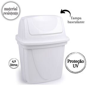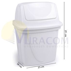 Conjunto com 10. A lixeira plástica com tampa basculante é a solução ideal para manter sua pia ou mesa sempre limpas e organizadas com praticidade e estilo. Com capacidade para 4,9 litros, esta lixeira é perfeita para uso em cozinhas, bancadas e escritórios, sendo ideal para o descarte de pequenos resíduos diários. Fabricada em plástico de alta qualidade, a lixeira é durável e resistente, garantindo um uso prolongado e eficiente. A tampa basculante tipo vai e vem oferece conveniência e higiene, permitindo que você descarte o lixo de maneira rápida e fácil, sem a necessidade de tocar diretamente na tampa. Este mecanismo mantém os odores controlados e impede a visualização do conteúdo interno, contribuindo para um ambiente mais limpo e agradável. Além disso, a lixeira conta com proteção contra raios UV, o que assegura que a cor e a qualidade do material permaneçam intactas mesmo quando exposta à luz solar. Essa característica torna a lixeira ideal tanto para ambientes internos quanto externos, garantindo sua durabilidade e estética ao longo do tempo. Com um design moderno e compacto, a lixeira se adapta perfeitamente a qualquer decoração, ocupando pouco espaço e oferecendo grande capacidade de armazenamento de resíduos. A lixeira de 4,9 litros é ideal para atender às necessidades diárias de descarte de lixo em cima da pia ou mesa, proporcionando uma solução prática e eficiente. A lixeira é fácil de limpar, permitindo que você mantenha a higiene e a aparência do produto com pouco esforço. Seu material resistente é projetado para suportar o uso diário, garantindo que a lixeira permaneça funcional e esteticamente agradável por muito tempo. Material: polipropilenoCapacidade: 4,9 litrosComprimento: 23 cm / Largura: 18 cm / Altura: 29 cm