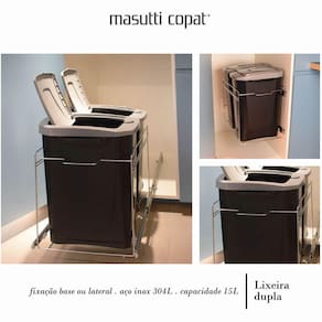 Garantia: 90 dias / Peso: 2,265kg / Cor predominante: preto / Referência: 7899085137632 Dimensões de cada lixeira com tampa: 31cm (C) x 28cm (L) x 41,5cm (A); Dimensões lixeiras com o suporte: 39cm (C) x 29,5cm (L) x 45cm (A); Comprimento corrediça aberta: 50cm; Capacidade de cada lixeira: 15 litros; Quantidade de lixeiras: 2; Quantidade de corrediças: 2; Materiais: estrutura em aço cromado e cestos de lixo em plástico polipropileno.