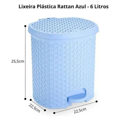 Lixeira Rattan plástico com pedal para cozinha e banheiro.- 6 litros- Modelo Pedal A lixeira é equipada com pedal, podendo ser usada com saco coletor de lixo. Ideal para banheiro, escritório, produto que agrega organização higiênica a sua cozinha, são mais que essencial para manter um ambiente limpo e agradável. Desenvolvido em material plástico polipropileno novo de primeira qualidade. Características:Material polipropileno.Capacidade de armazenamento 6 litrosAltura 25,5 cm.Largura 22,5 cmProfundidade 22,5 cm