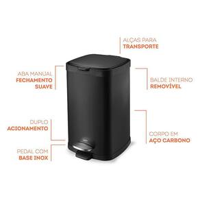Lixeira Com Pedal E Balde Frame 12L Preto Brinox Descrição: A Lixeira com pedal, corpo de aço carbono e balde removível da linha Frame, serve tanto para combinar com ambientes modernos quanto para descontrair os mais tradicionais, dando um toque de requinte e sobriedade ao cômodo. Bonita e versátil, ela possui duplo acionamento, aba manual, pedal com base de inox e, pode ir da cozinha ao escritório. A tampa de inox com alça e fechamento suave traz mais facilidade e praticidade ao utilizar e transportar o produto. Contém: 1 Lixeira 12L Importante: Material: Aço Carbono Cor predominante: Preto Capacidade: 12L Dimensões: 33,9 x 26,1 x 40,3 cm Ean: 7896502849178