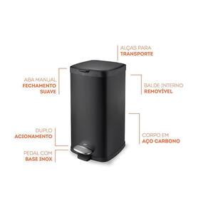 Lixeira Com Pedal E Balde Frame 20L Preto Brinox Descrição: A Lixeira com pedal, corpo de aço carbono e balde removível da linha Frame, serve tanto para combinar com ambientes modernos quanto para descontrair os mais tradicionais, dando um toque de requinte e sobriedade ao cômodo. Bonita e versátil, ela possui duplo acionamento, aba manual, pedal com base de inox e, pode ir da cozinha ao escritório. A tampa de inox com alça e fechamento suave traz mais facilidade e praticidade ao utilizar e transportar o produto. Contém: 1 Lixeira 20LImportante: Material: Aço CarbonoCor predominante: PretoCapacidade: 20LDimensões: 35,5 x 27 x 47,7cm