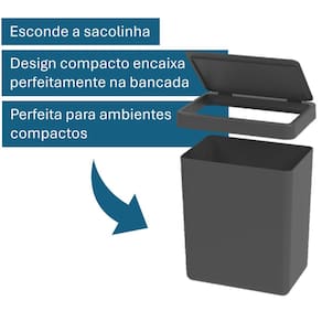 DIFERENCIAIS: Com um design retangular, essa lixeira se encaixa perfeitamente na bancada da pia, ocupando pouco espaço e deixando tudo mais organizado. Além disso, ela possui aberturas na lateral que permitem o encaixe do saco ou sacola plástica, ficando ocultados pela tampa, proporcionando um visual limpo e discreto.