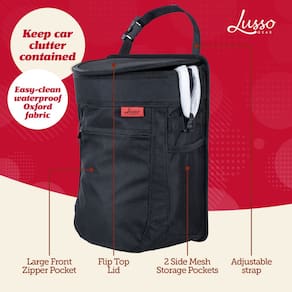 Lusso Gear Lata de lixo para carro à prova de derramamento (preta, 2,5 galões) - Limpeza simples do carro: mantenha seu passeio limpo com esta grande lixeira de carro. Este saco de lixo para carro é perfeito para guardar embalagens e bagunça, também tem bolsos para armazenamento extra. Esta lixeira de carro à prova de derramamento para homens e mulheres é um acessório de carro essencial para homens e mulheres, encaixando-se perfeitamente em qualquer veículo - Estrutura Oxford robusta: esta lixeira de carro para banco traseiro e banco dianteiro é feita de material Oxford à prova d'água, esta lixeira para carros é fácil de limpar e construída para durar. A tampa flip-top mantém o lixo escondido e os odores presos, mantendo seu veículo fresco. Ideal para acessórios de carro para mulheres e acessórios de caminhão para homens - Design sem bagunça: esta lixeira para carro vem com um forro removível e à prova de vazamentos. Esta lixeira facilita a limpeza de derramamentos. Basta remover o forro em vez de toda a lata. Os ganchos permitem bolsas descartáveis extras para maior segurança. É um saco de lixo essencial para qualquer solução de lixo automotivo - Road Trip Buddy: Se você estiver em uma longa viagem ou apenas viajando, este saco de lixo para carro é o seu preferido. A lixeira do veículo possui bolsos laterais de malha e um grande bolso frontal com zíper para seus itens essenciais de viagem. Pendure no banco traseiro ou sobre o encosto de cabeça para facilitar o acesso - Lusso Gear Excelência: Lusso Gear tem tudo a ver com melhorar sua direção. Esta lata de lixo para carro cabe nos bancos dianteiros e traseiros, misturando-se perfeitamente com os acessórios do seu caminhão. Mantenha seu carro limpo, organizado e elegante com esta ferramenta essencial de organização de carro