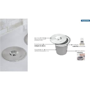 Características: Instalação: Embutida Material: Aço Inox AISI 304 Espessura: 1 mm Acabamento: Polido Tampa: Sim Balde plástico removível: Sim Capacidade: 8 L Saco de lixo recomendado: 15 - 20 L