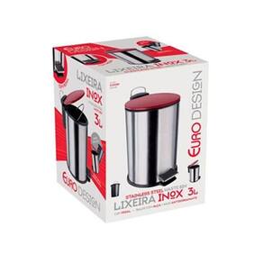 Lixeira De Inox Com Tampa Vermelho 3 Litros - Euro Lixeira de inox com tampa vermelho com capacidade pra 3 Litros. Observação: As cores dos produtos podem sofrer variações em função das características do monitor e do ambiente durante sua visualização. Características: com pedal, balde co alça, base antiderrapante. Matéria prima: aço inox, PP, ferro e pintura. Medida aproximada da embalagem: Comp.X Larg.X Alt. : 19x19x25 cm.