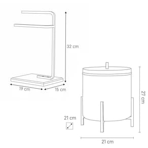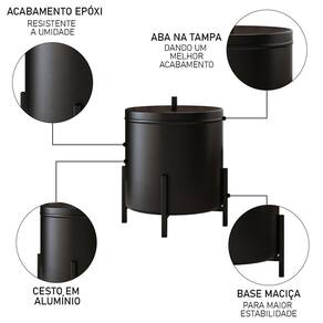 A Lixeira conta com uma base em aço maciço, o cesto é em alumínio e se encaixa na base evitando o com o chão, uma peça prática que ainda deixa o banheiro com um design muito mais moderno, também conta com uma aba na tampa para um acabamento melhor após a colocação da sacolinha, por ter uma base maciça ele tem um peso consistente, que contribui para uma estabilidade adequada. Acompanha também Porta Toalha de Rosto para bancada, com pintura epóxi com resistência a umidade no acabamento preto fosco, proporcionando um design muito mais moderno e elegante.