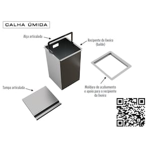 O modelo contém: Tampa e moldura de acabamento totalmente em aço inox AISI 304, tampa com exclusivo sistema articulado, balde de 3,9 litros em aço inox AISI 430, sistema com dissipador para odores.