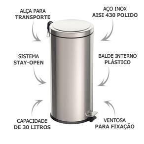 Informações Adicionais: Capacidade: 30 Litros Marca: Tramontina EAN: 7894693039118 Código Referência: 94538130 Composição: Aço Inox AISI 43 Espessura: 0,4 mm Acabamento: Polido Tratamento anti digitais: Não Alça para transporte: Sim Abertura: Pedal Tampa: Sim, com sistema Stay Open Fechamento suave da tampa: Não Balde plástico removível: Sim Capacidade: 30 L Saco de lixo recomendado: 40 - 60 L