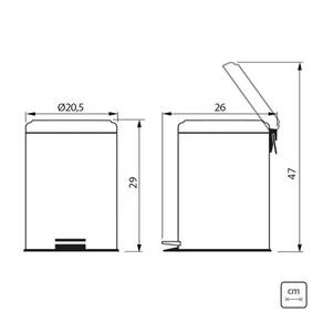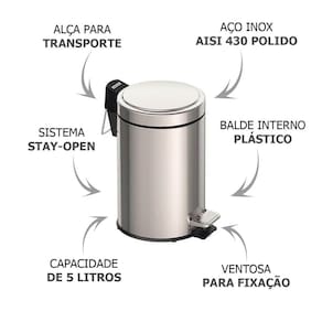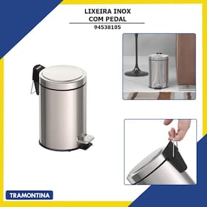 Informações Adicionais: - Capacidade: 5 Litros - Marca: Tramontina - EAN: 7894693039088 - Código de Referência: 94538105 - Composição: Aço Inox AISI 430 - Espessura: 0,34 mm - Acabamento: Polido - Tratamento anti digitais: Não - Alça para transporte: Sim - Abertura: Pedal - Tampa: Sim - Fechamento suave da tampa: Não - Balde plástico: Sim, sem alça - Saco de lixo recomendado: 10 - 15 L - Garantia: 1 ano (90 dias de garantia legal acrescidos de 09 meses de garantia contratual) para vícios ou defeitos de fabricação